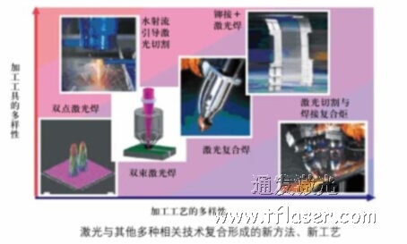 就拿激光焊接技術(shù)來說,在激光復(fù)合工藝的發(fā)展中已出現(xiàn)了如雙點(diǎn)或雙束激光的復(fù)合、激光與電弧的復(fù)合、激光與攪拌摩擦熱復(fù)合以及激光與電阻熱復(fù)合等形式;并呈現(xiàn)與其他相關(guān)技術(shù)結(jié)合及功能延伸的趨勢,如與水射流、鉚接等結(jié)合而形成的新工藝(見圖)。