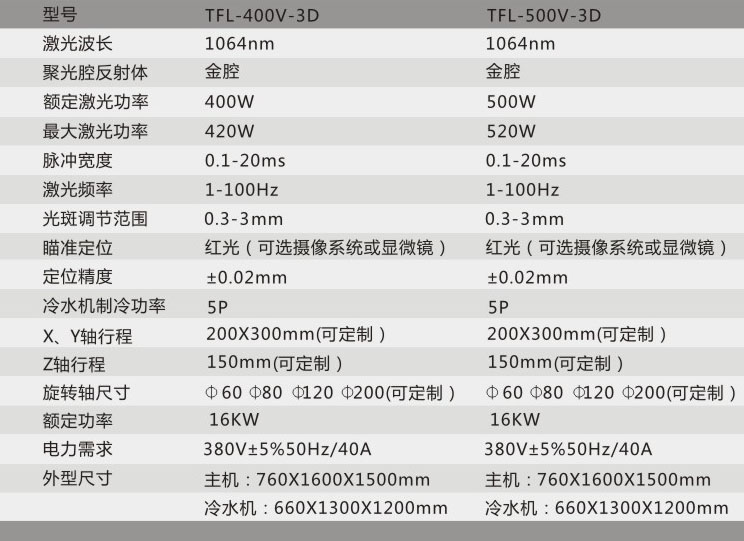1、TFL-400V/500V-3D,由雙路氙燈泵浦、進口陶瓷反射腔體及Nd:YAG晶體棒構成激光器,電光轉換效率高。