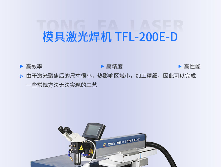 出口型模具激光焊機(jī)是通發(fā)激光公司專(zhuān)門(mén)為出口國(guó)外客戶(hù)使用而設(shè)計(jì)的系列機(jī)型TFL-200E-D,配置激光頭電動(dòng)升降,同時(shí)配置操縱桿無(wú)極調(diào)速控制XY橫向和縱向電動(dòng)移動(dòng)。適用于各類(lèi)精密注塑模具、壓鑄模具等模具激光修補(bǔ)焊接;同時(shí)也適合鑄件沙孔激光修補(bǔ)、模具崩缺激光修復(fù)、過(guò)切加工等的激光修補(bǔ);各類(lèi)金屬結(jié)構(gòu)件、金銀首飾的激光焊接加工。